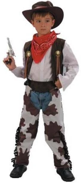 Boys Cowboy costume, includes Brown Waiscoat, Cowprint Chaps, Red Bandana and Hat.