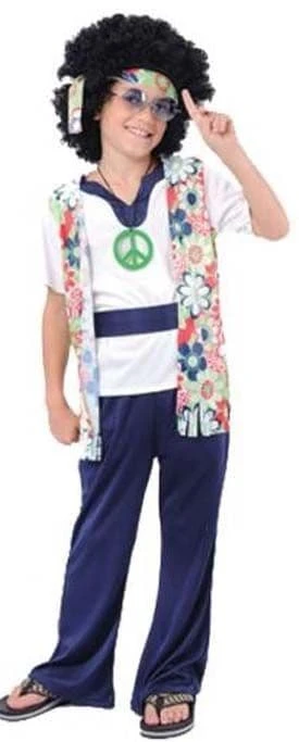 Boys Hippie Fancy Dress Costume, includes Shirt with attached Waiscoat, Blue Trousers, Headband, Belt and Medallion.