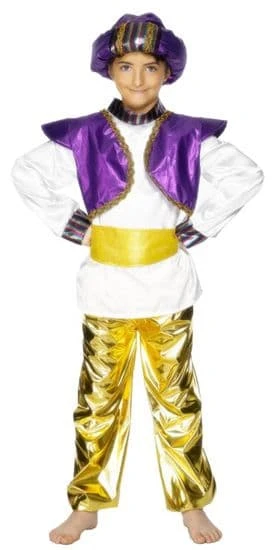 Boys Sultan fancy dress costume. Boys Sultan costume includes top, trousers, waistcoat, belt and hat.