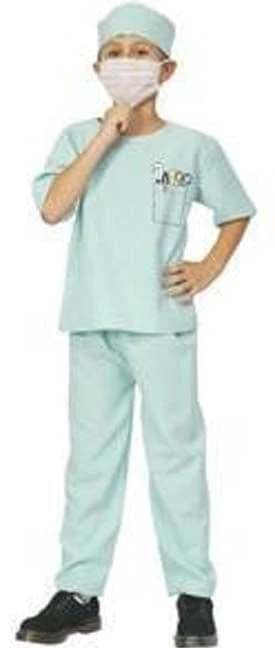 Childs Doctor costume with pale green top, trousers, hat and facemask. Light weight 100% polyester.