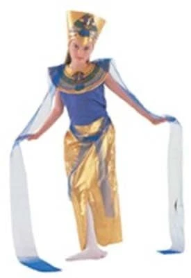 Girls Queen of the Nile fancy dress costume. Girls Queen of the Nile costume includes blue and gold robe, with Egyptian style collar and head piece.