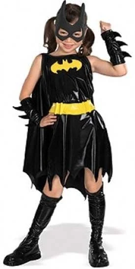 Girls Licensed Batgirl Costume, includes Black Dress with Batman Motif, attached Cape, Yellow Belt, Black Boot Covers, Gauntlets and Batgirls Headpiece
