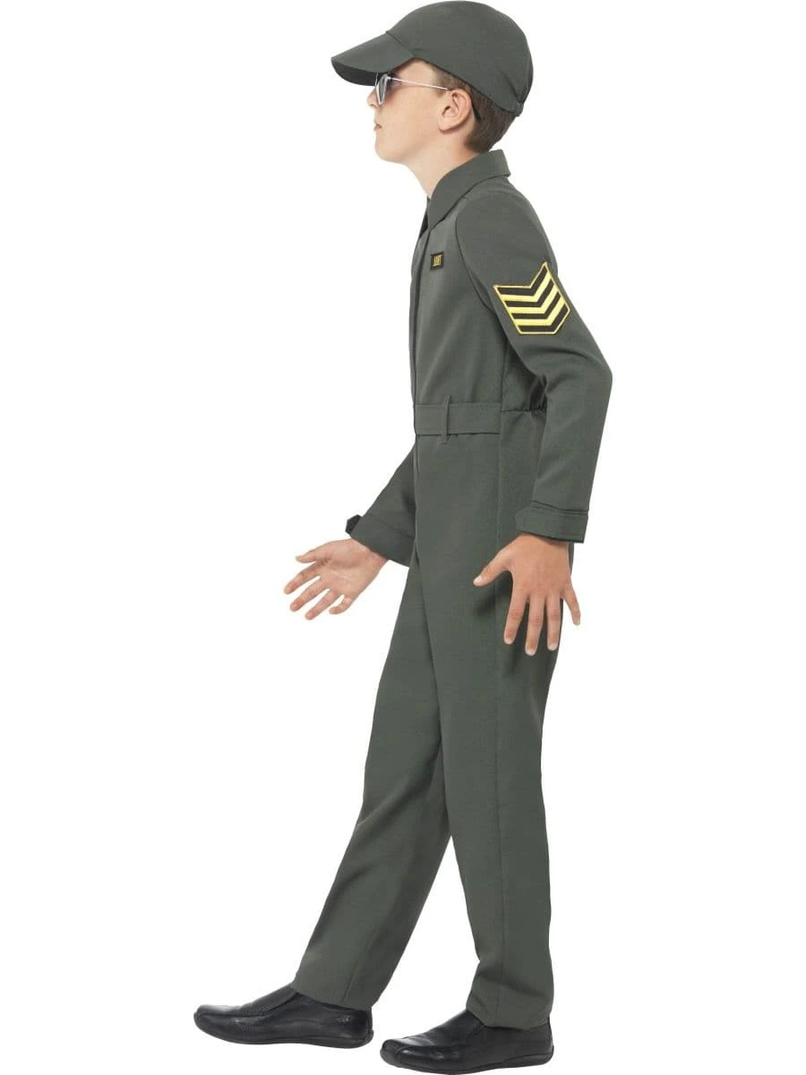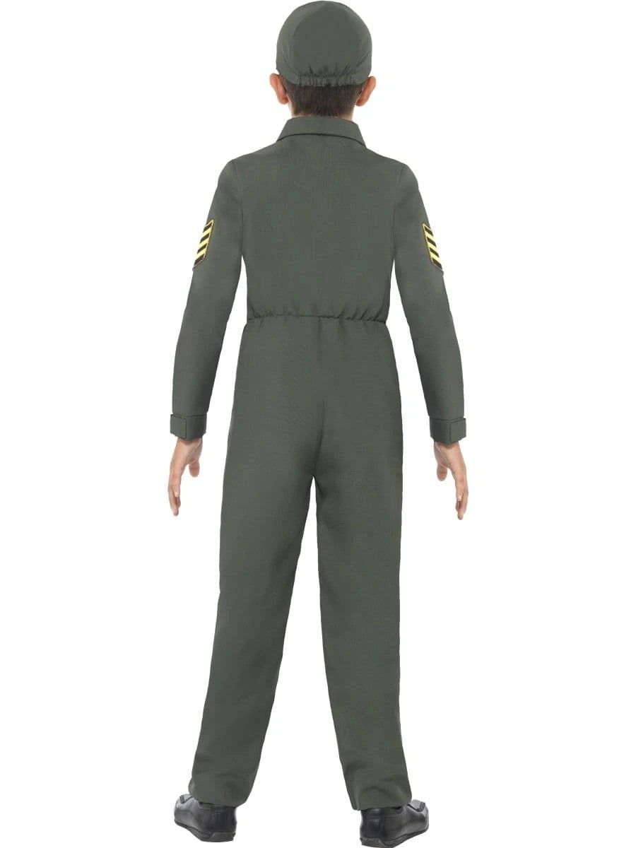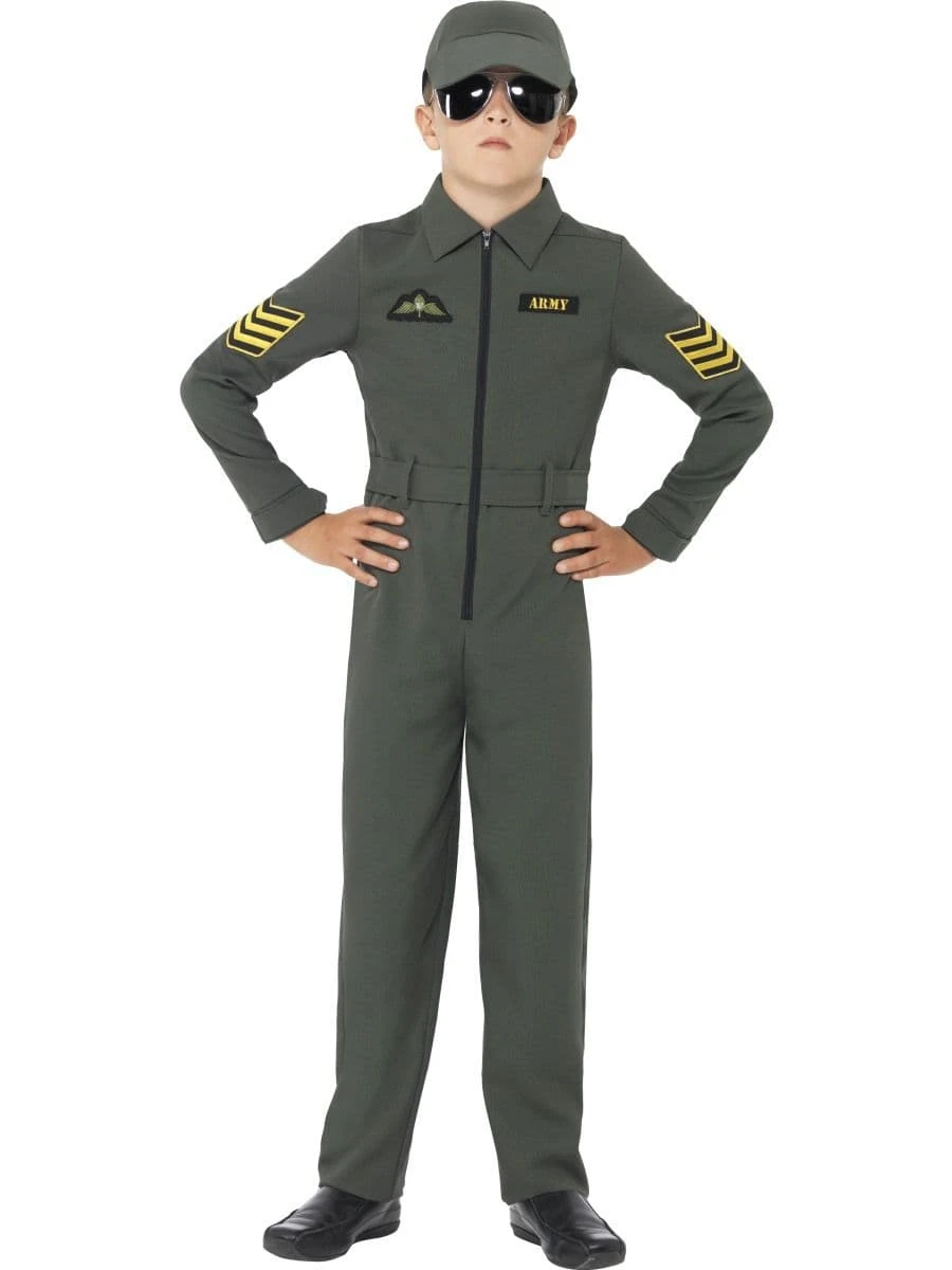 An authentic looking aviator or fighter pilot costume aimed at the boys but also gets sold for the girls. This great looking costume includes airman’s jumpsuit in bottle green with attached belt and cap. Just add shades for the super cool look.