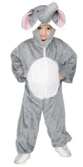Childs Elephant fancy dress costume. Childs Elephant costume includes grey zip-up jumpsuit with hood featuring Elephant face, trunk, tusks and ears.