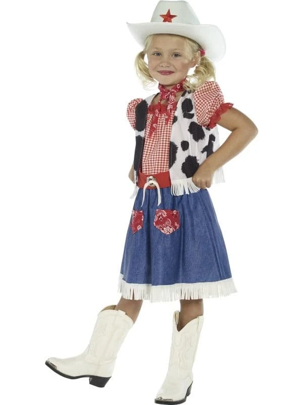 Girls Cowgirl Sweetie Costume, includes Blue and Red Dress, with Cowskin Effect Waistcoat, Red Neck Scarf, Red Belt and White Cowboy Hat.