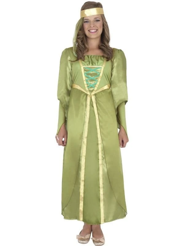 Girl’s Maid Marion Costume, includes long green satin effect dress and gold coloured headband. Perfect for Robin Hood and book day themes as well as film and cartoon.