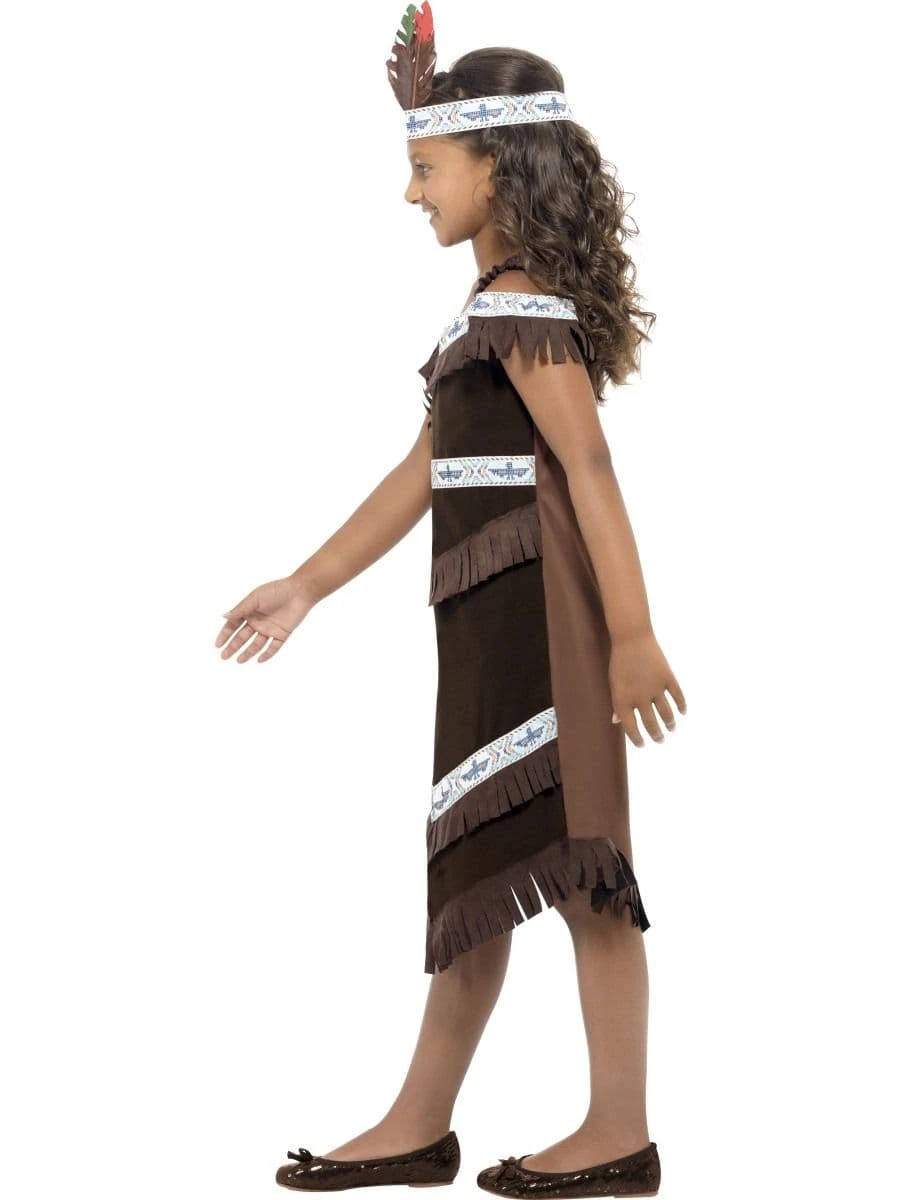 A lovely girl’s indian squaw wild west costume. Authentic looking and pretty detailing make this a popular costume which includes brown fringed dress with wild west indian detailing and feather headband. Perfect for upstaging the boys at ‘cowboys and indian’ parties but makes a great Pocahontas costume too.