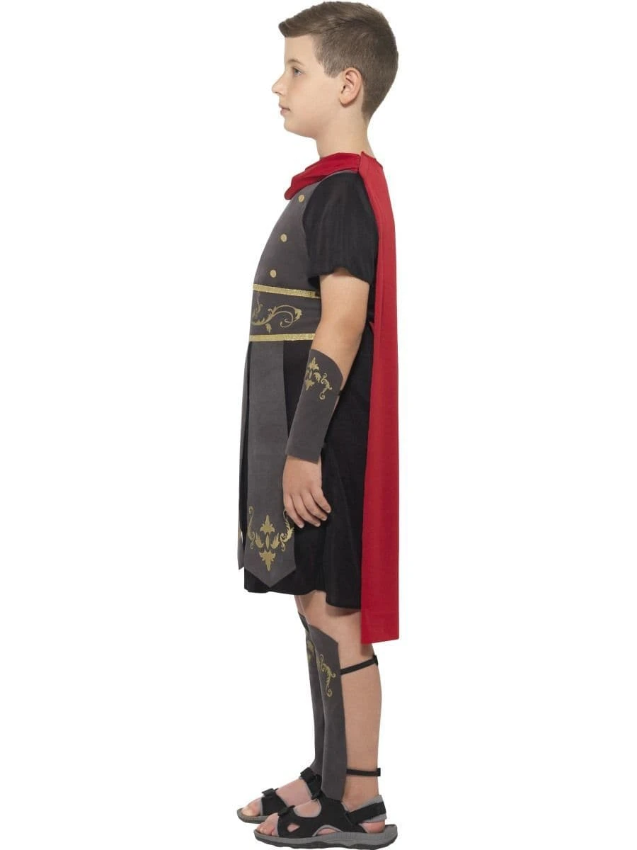 New for 2017 a great looking Roman Soldier/ Centurion boys fancy dress costume. This detailed outfit includes a tunic with cape plus motifed arm and leg cuffs. Perfect for school Roman history projects and themes and visits to Roman sites (or just for dressing up)